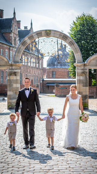 Rummet i Frederiksborg Slotskirke er HELT fantastisk og meget smuk. Den smukke brud blev fulgt op af hendes far og brudeparrets to små sønner - et meget flot syn. Efter vielsen spadserede det nygifte par og deres to små friske sønner en tur ud i slotshaven, hvor vi skulle fotografere parret. Her var masser af flotte og stemningsfyldte gode spots.